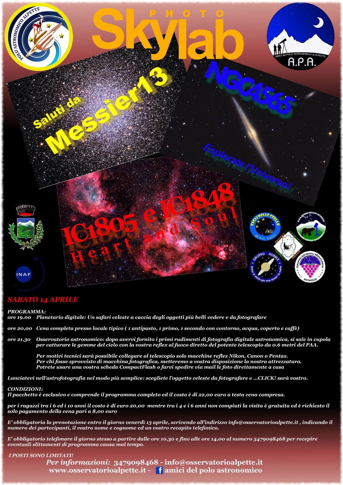 E’ obbligatoria la prenotazione entro il giorno venerdì 13 aprile, scrivendo all’indirizzo info@osservatorioalpette.it , indicando il numero dei partecipanti, il vostro nome e cognome ed un vostro recapito telefonico.