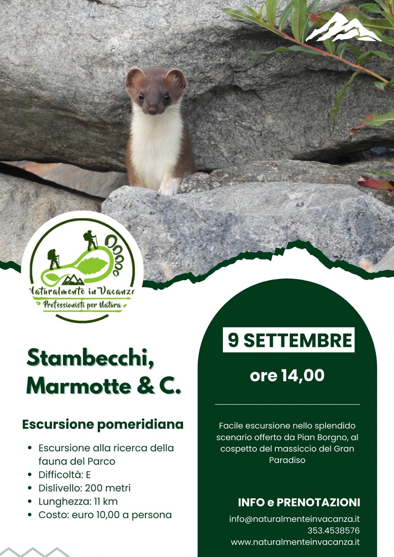 Escursione pomeridiana alla ricerca della fauna del Parco: stambecchi, camosci, marmotte ci aspettano nell'incantevole scenario offerto da Pian Borgno, al cospetto del Gran Paradiso.