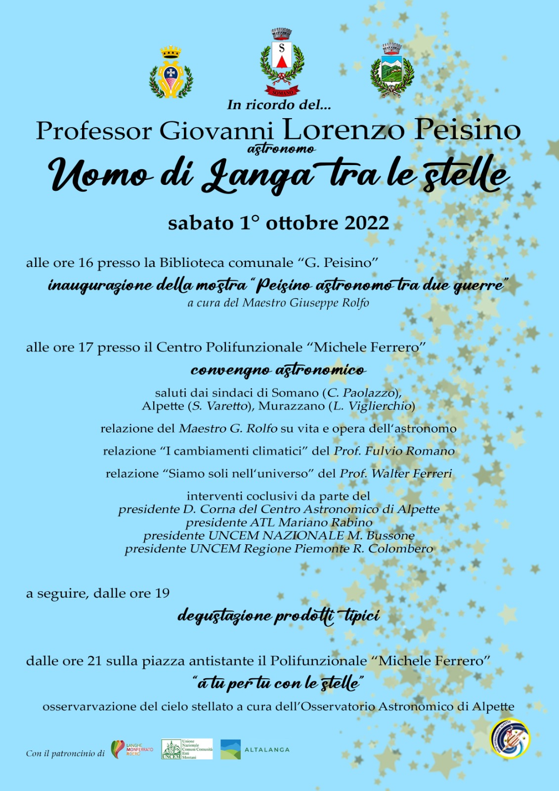 alle ore 17:00 presso il centro polifunzionale "michele ferrero" si svolgerà il convegno astronomico con i saluti dei sindaci di Somano (C. Paolazzo), Alpette (s. Varetto) e Murazzano (l. Viglierchio).