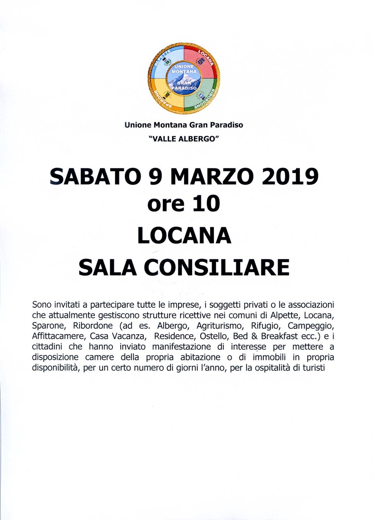 Sono invitati a partecipare tutte le imprese, i soggetti privati o le associazioni che attualmente gestiscono strutture ricettive nei comuni di Alpette, Locana, Sparone, Ribordone (ad es. Albergo, Agriturismo, Rifugio, Campeggio, Affittacamere, Casa Vacanza, Residence, Ostello, Bed & Breakfast ecc.) e i cittadini che hanno inviato manifestazione di interesse per mettere a disposizione camere della propria abitazione o di immobili in propria disponibilità, per un certo numero di giorni l’anno, per la ospitalità di turisti.