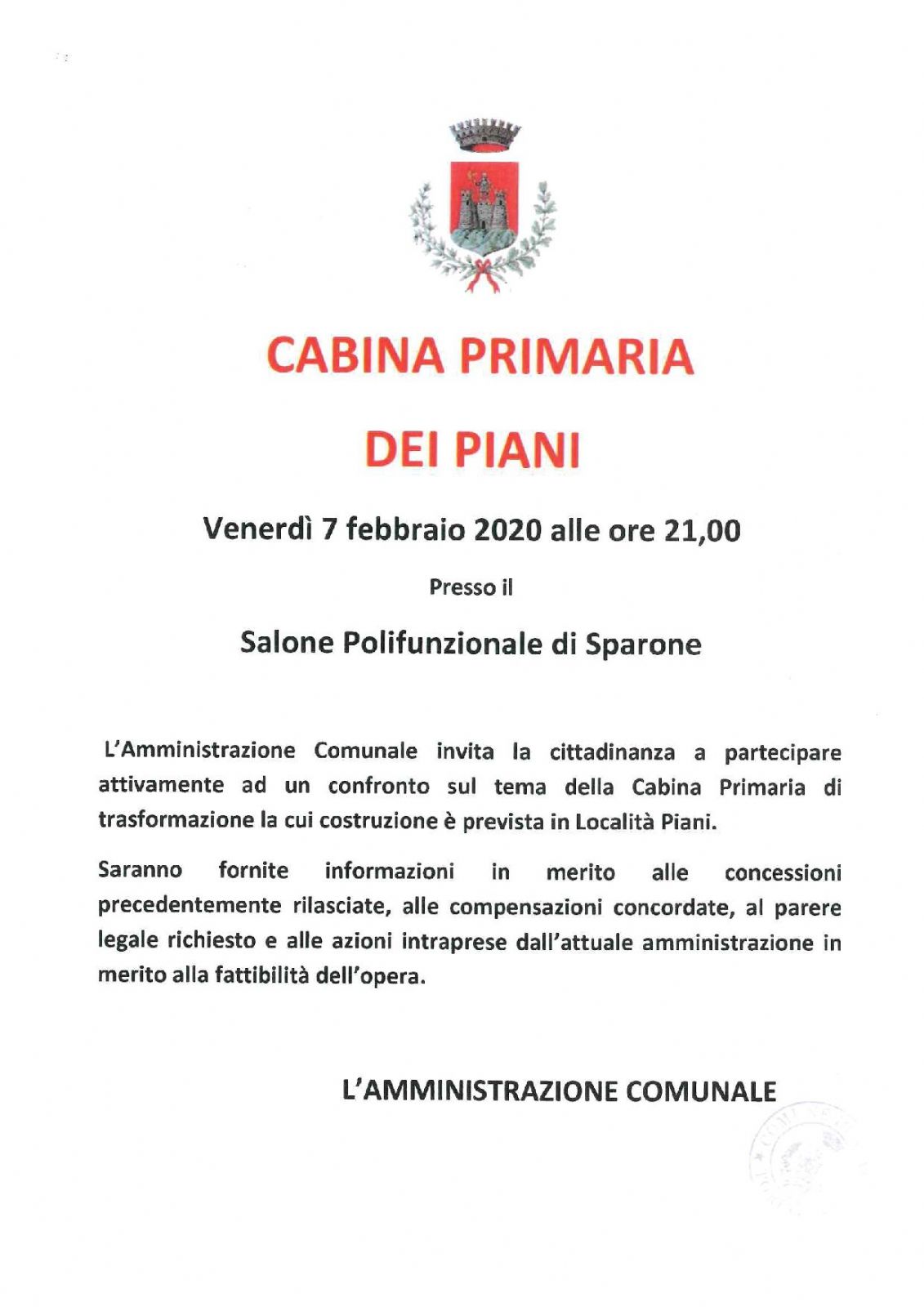 L'amministrazione comunale invita la cittadinanza a partecipare attivamente ad un confronto sul tema della Cabina Primaria di trasformazione la cui costruzione è prevista in località Piani di Sparone.