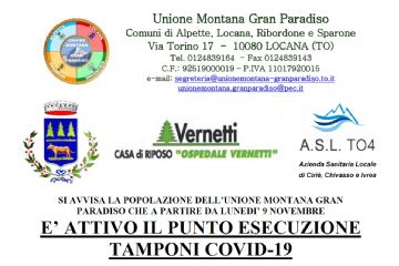 TAMPONI DRIVE IN A LOCANA IN CONVENZIONE CON LA RSA VERNETTI A PARTIRE DAL 9 NOVEMBRE