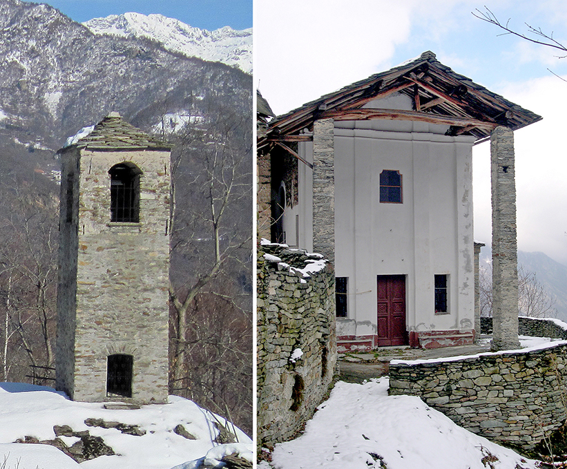 Dalla visita pastorale di Mons. Milliet del 1660 risulta che la cappella fu costruita e benedetta in quello stesso anno; fu poi restaurata e ampliata nel 1772. L'interno è decorato da affreschi del 1820 e conserva alcune tele del '700 e '800 e varie tele ex-voto. L'altare laterale, dedicato all'Addolorata, è del 1886. Di fianco alla chiesa si erge la "casa della cappella" costruita nella prima metà dell'800. Il campanile, edificato nel 1694, si erge isolato su un masso roccioso a poca distanza dalla chiesa.
