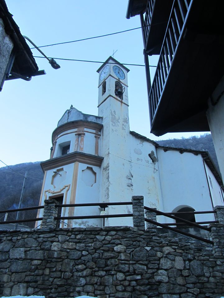 L'edificio è realizzato in muratura tradizionale in pietra a spacco locale saldata con malta. La facciata si presenta convessa semicircolare di matrice tardo settecentesca, intonacata e decorata con motivi geometrici. Il tetto a due falde presenta orditura lignea, con trave di colmo orientato nel senso longitudinale della pianta, e il manto di copertura in 'lose'. Sul fianco destro della costruzione è addossato un campanile, interamente intonacato e con orologi sulle facce della parte superiore, e si aprono finestre rettangolari a garantire l'illuminazione della navata. L'interno ad aula unica con cappelle laterali, di cui una è stata adibita a sacrestia, risulta affrescato con motivi geometrico-naturalistici e a carattere religioso. La copertura dell'aula è risolta con due volte a vela mentre quella dell'ingresso da un cupolotto e quella dell'abside da una semicalotta. Al di sopra dell'ingresso è realizzato un bel coro ligneo a forma di ferro di cavallo anch'esso decorato con affreschi geometrico-naturalistici.