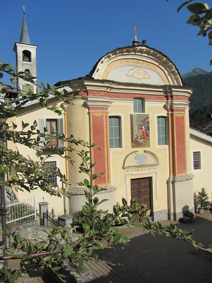 Terminata e consacrata da Monsignor Trucchi nel 1681, fu edificata sulle macerie dell'antica parrocchiale dedicata a San Meineiro, distrutta nel 1628 da una frana che sconvolse il capoluogo. Le uniche testimonianze dell'antico edificio si possono trovare nella torre campanaria che, nel suo interno, lascia trasparire indubbie tracce di stile romanico rappresentate dalle bifore in micascisto locale databili intorno all'anno 1300.