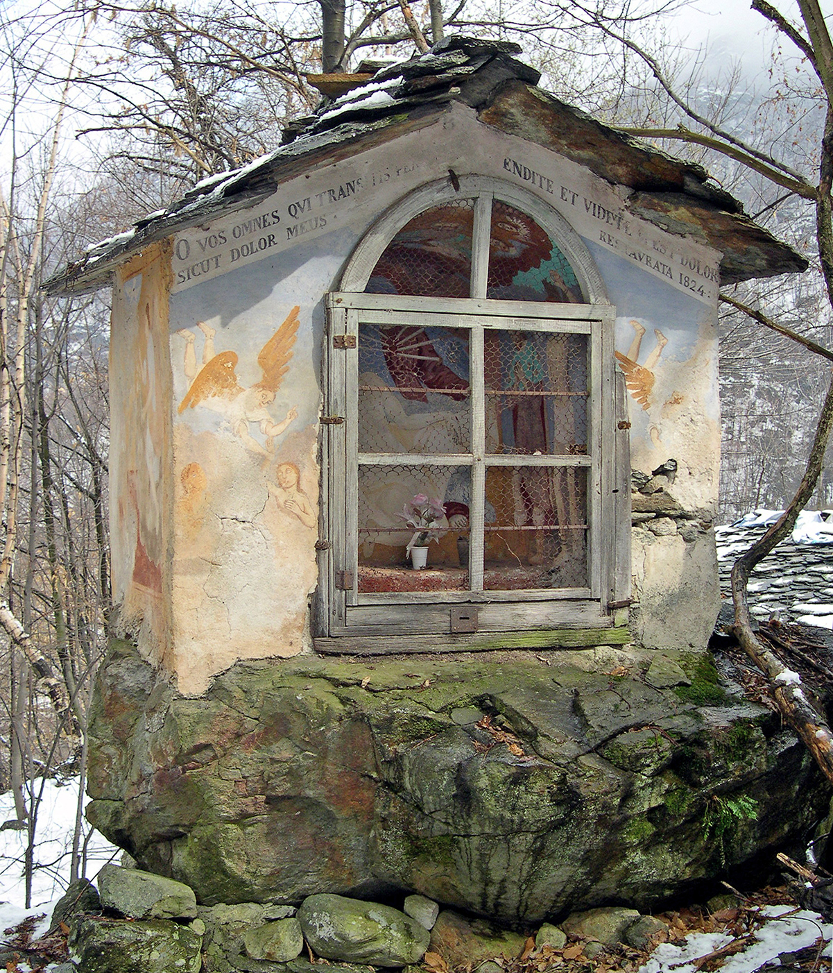 Appena sotto l'Aia di Pietra, in borgata Pasqualone, vi è il pilone votivo dell'Addolorata, risalente secondo la tradizione al 1535, data riportata sotto lo spiovente. È costruito su un masso erratico ed è completamente affrescato, sia nella nicchia che all'esterno; fu restaurato nel 1824 ed è già citato in un consegnamento del 1717. Il pilone era custodito e gestito da un Tesoriere, che annotava su un registro e curava la celebrazione della festa dell'Addolorata che era officiata nella chiesa di Sant'Anna all'Aia di Pietra.