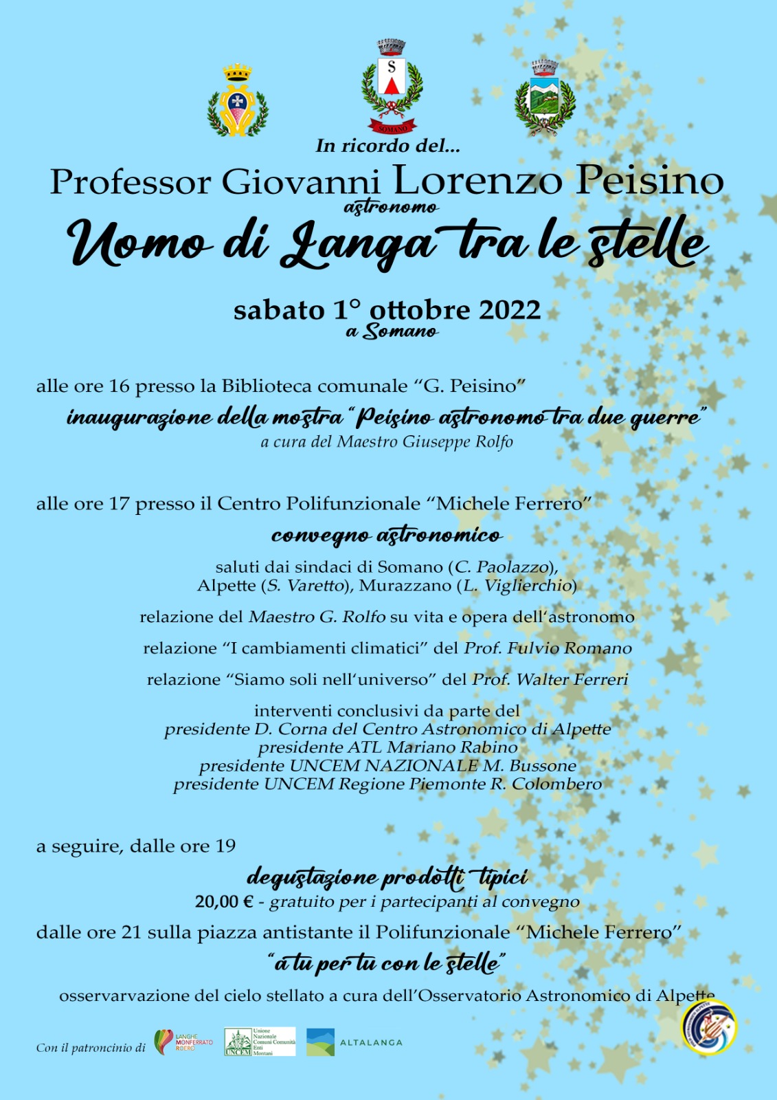 In ricordo del professor Giovanni Lorenzo Peisino sabato 1° ottobre 2022 alle ore 16:00 presso la Biblioteca Comunale "G. Peisino" di Somano (cn) si terrà l'inaugurazione della mostra "Peisino astronomo tra due guerre".